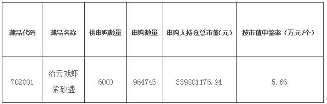 本次中簽分配方式按持倉市值搖號(hào)中簽,請廣大參與申購的投資會(huì)員關(guān)注交易賬號(hào)中持倉數(shù)量和資金變化情況。《流云戲蝦紫砂盞》將于2017年1月19日正式掛牌交易。